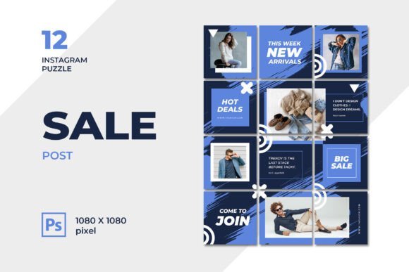 This Blue Big Sale fashion puzzle template is designed as a 12-square Instagram grid that forms one seamless, connected composition. Built in Photoshop, each section is fully editable, allowing you to easily customize text, colors, backgrounds, and images using smart layers. The organized PSD structure ensures a smooth editing experience, making it simple to replace visuals and adapt the design to your brand style.